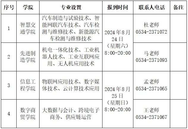 根据新生登记的报到行程,学校在德州汽车客运站、火车站(德州站)、高铁站(德州东站)均设置有新生报到接站服务点。各位新生可以到就近接站地点乘接站车辆到学校报到。接站时间:8月24日—8月25日,每天8:30-18:30流水发车,其余时间到站的新生,需自行乘坐公交车或者出租车来校报到(到达学校的公交车次有56路和304路,同学和家长们可在手机应用市场下载“德州智能掌上公交”APP,提前做好规划)