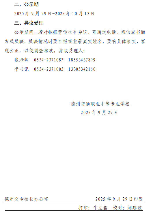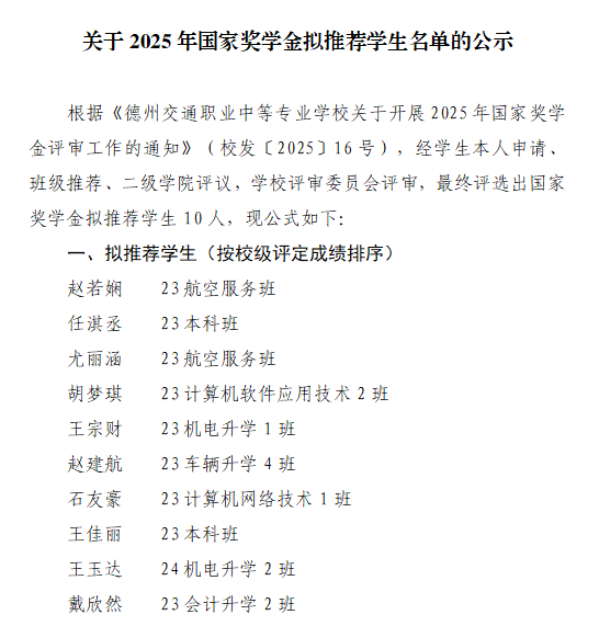 关于德州交通职业中等专业学校2025年国家奖学金拟推荐学生名单的公示