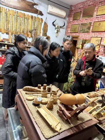 随后,师生一行前往董子文化街“木人堂”木刻刀笔书画工作室,拜访省级非物质文化遗产代表性传承人唐万武先生。工作室中竹木清香四溢,匾额、书签、木简等各类作品琳琅满目,尤其是7000多字的《孙子兵法》木简作品,以自然随形的材质与精雕细琢的工艺,让学生们叹为观止。他结合自身创作经历,分享了如何通过叠刻手法表现书画的浓淡干湿,以及在作品中融入地域文化元素的创作思路,鼓励学生既要传承传统技艺精髓,又要贴合现代生活需求进行创新。
