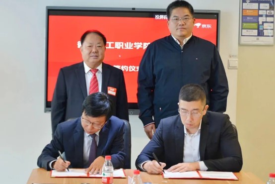 魏荣庆与京东零售集团教育大客户部负责人张笑宁分别代表校企双方签订产业学院合作协议。