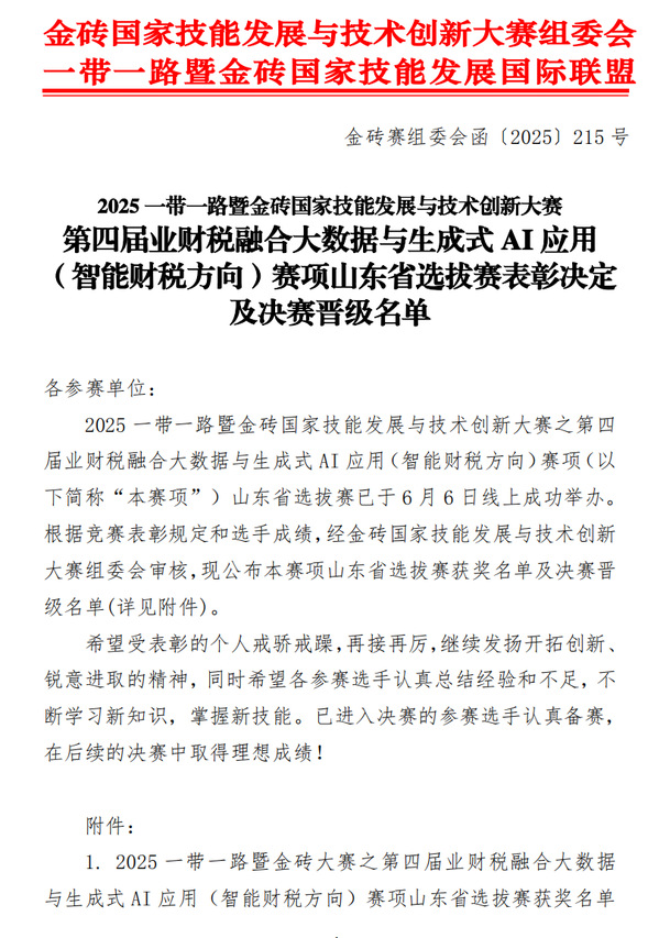 近日,2025一带一路暨金砖国家技能发展与技术创新大赛第四届业财税融合大数据与生成式AI应用(智能财务方向)山东省选拔赛落下帷幕。pp电子大数据与会计专业参赛代表队经过激烈角逐,最终斩获两个三等奖,教师组李辰雨老师冲进决赛,为学校再添荣誉。