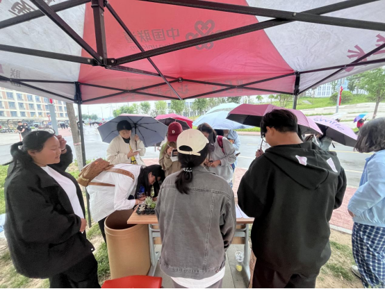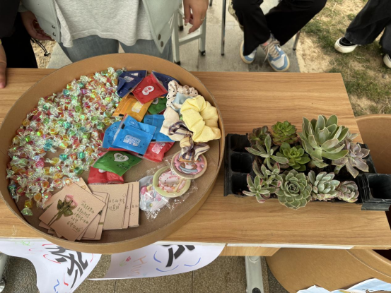 下午四点,帐篷搭起,伴随着下课铃声的响起,小铺前学生聚成一团,参与者可以写下自己的烦恼丢进树洞,也可以认领他人的烦恼纸条进行暖心回复,只要参与就可以获得多肉植物、小镜子、发绳、糖果以及钥匙扣盲袋等暖心礼品。