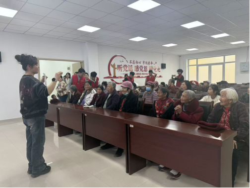 随后,志愿者登台献唱,以一首经典歌曲点燃了现场气氛。他歌声清亮而温暖,深深打动了在场的奶奶们。曲毕,台下掌声与喝彩声不断,几位老人更是笑容满面,热情挥手互动,将现场氛围推向高潮。